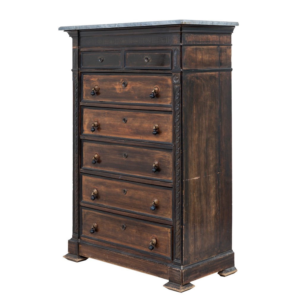Settimanile umbertino in legno esotico a cinque cassetti grandi e due piccoli, piano in marmo.