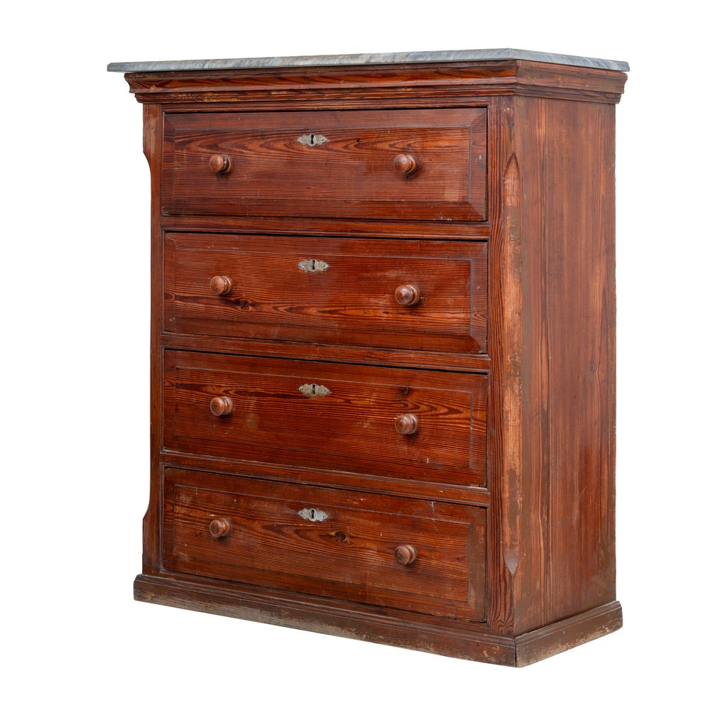 Piccolo cassettone a quattro cassetti in pino pece, piano in marmo grigio venato.