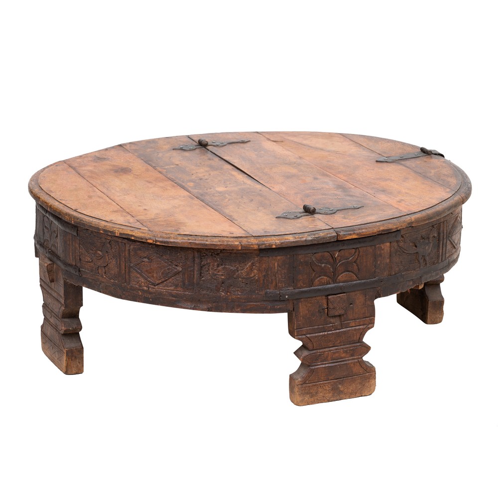 Tavolo basso in legno di teak con piano apribile, elementi in ferro.