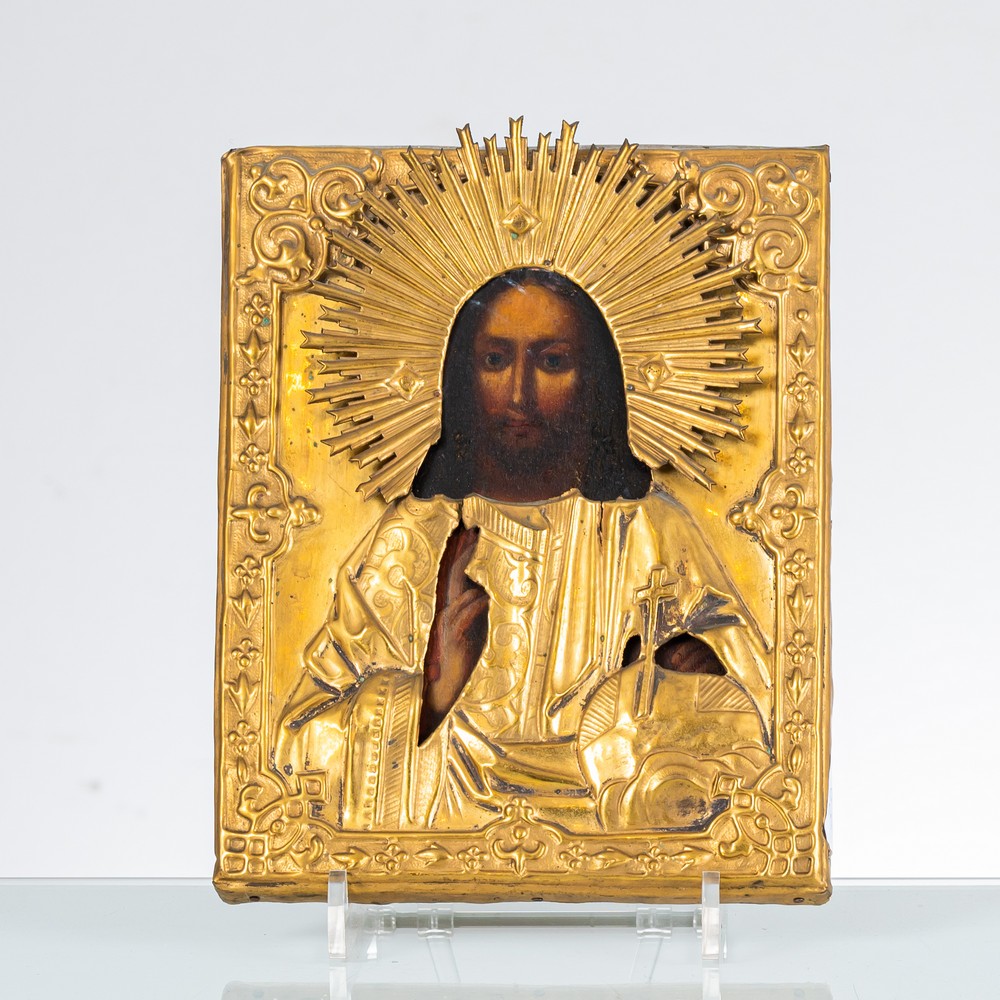 Icona in legno dipinto raffigurante "Cristo", riza in metallo dorato.