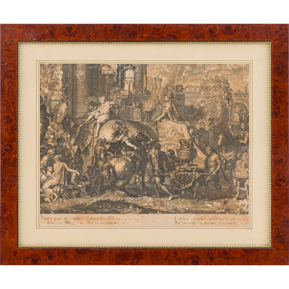 Incisione a bulino su carta raffigurante "Il trionfo di Alessandro Magno", tratta dalla celebre opera Charles Le Brun.