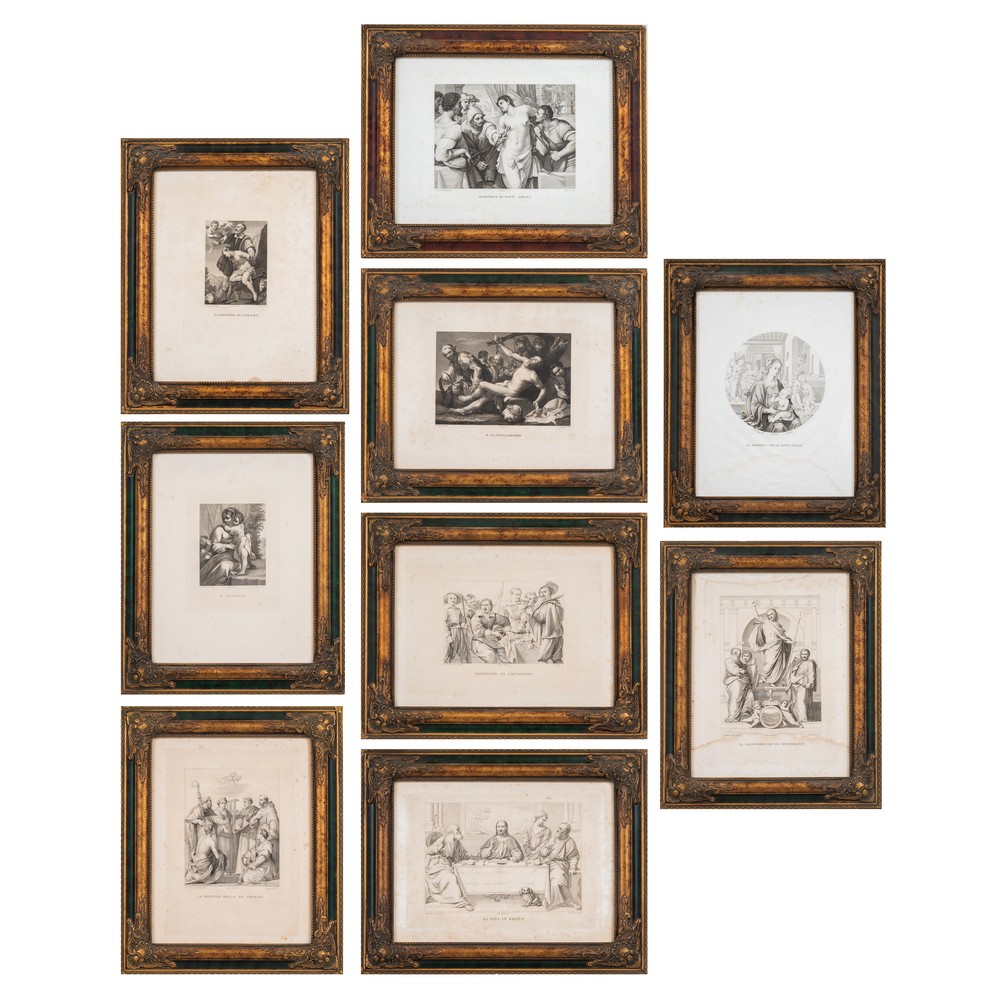 Nove incisioni entro cornici raffiguranti "Il Salvatore con gli Evangelisti", "Sacra Famiglia", "Le dispute della Santissima Trinità", "San Bartolommeo", "Ritrovato di cacciatori", "La cena in Emmaus", "La Madonna con il Divin Figliolo", "Martirio di Sant' Agata", "Sacrificio di Abramo".