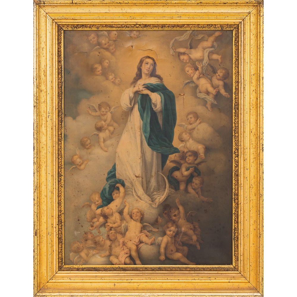 Cornice in legno dorato ad argento a mecca con all'interno oleografia raffigurante "L'Immacolata" (usure).