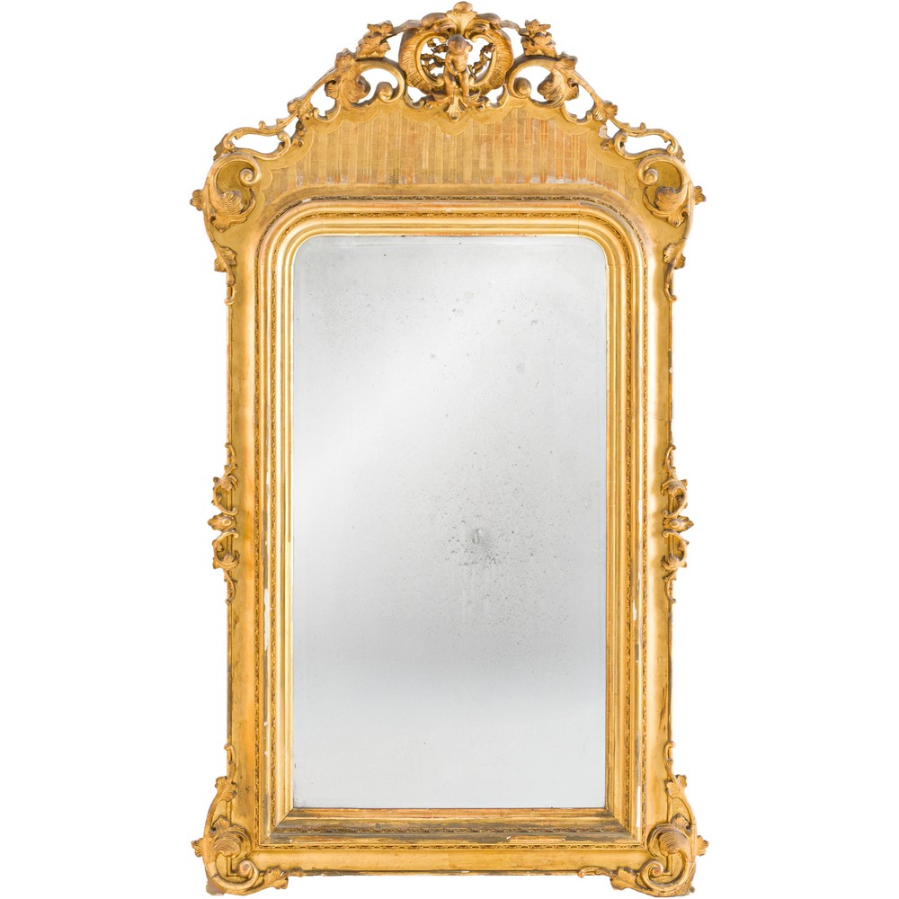 Specchiera in legno dorato ad oro zecchino, cimasa riccamente lavorata con grande putto centrale.