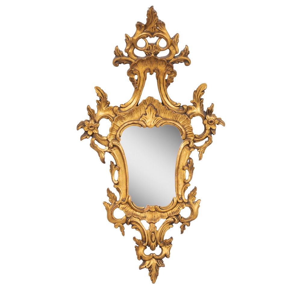 Specchiera stile Luigi XV a scudo in legno dorato.