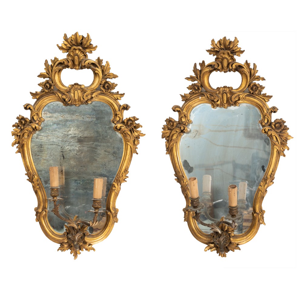 Coppia di piccole specchiere a scudo con applique stile Luigi XV a due luci in bronzo e legno intagliato e dorato.