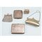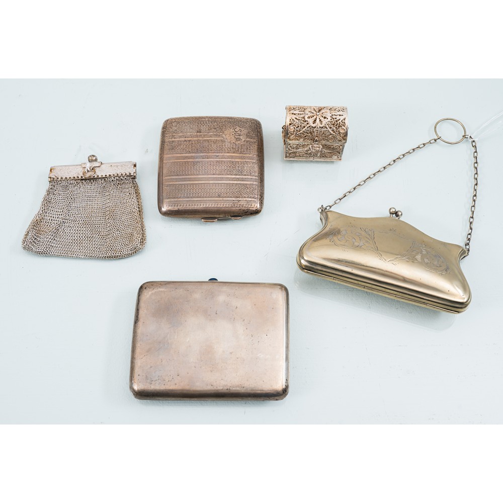 Piccolo scrigno, porta monete e borsetta in metallo argentato e due portasigarette in argento.