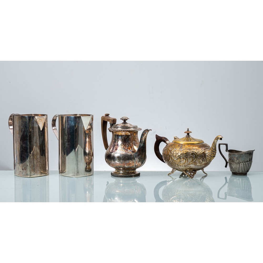 Caffettiera, teiera, lattiera e due brocche in sheffield e metallo argentato.