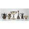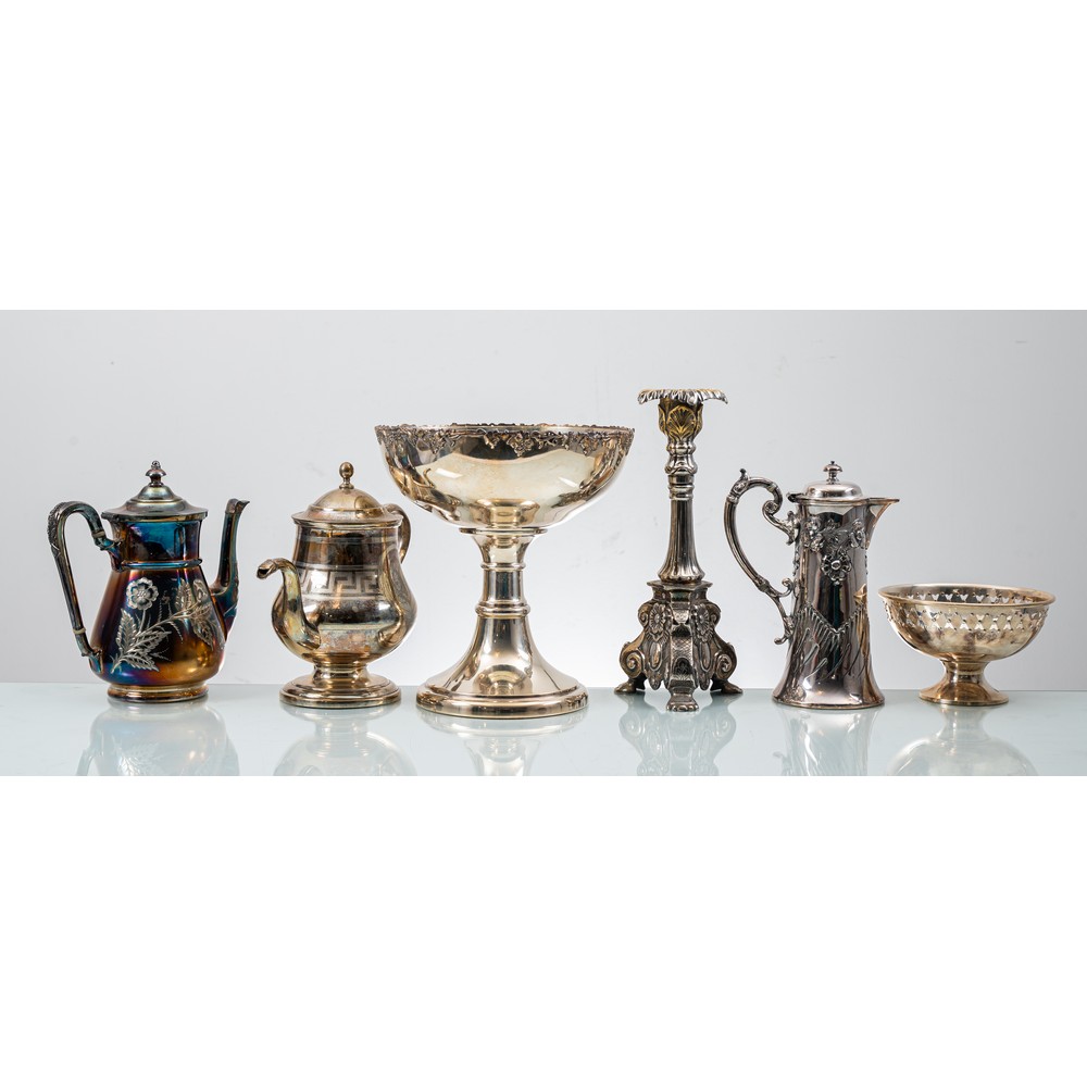 Candeliere, alzata, cioccolatiera e piccola alzata in sheffield lavorato e due teiere in metallo argentato (usure).