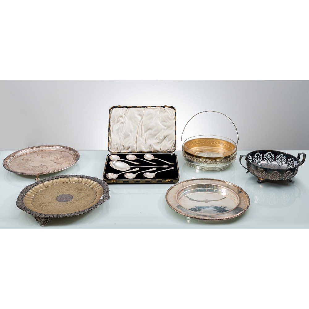 Quattro centrotavola, piatto e cofanetto contenente set di cucchiai da gelato in sheffield.