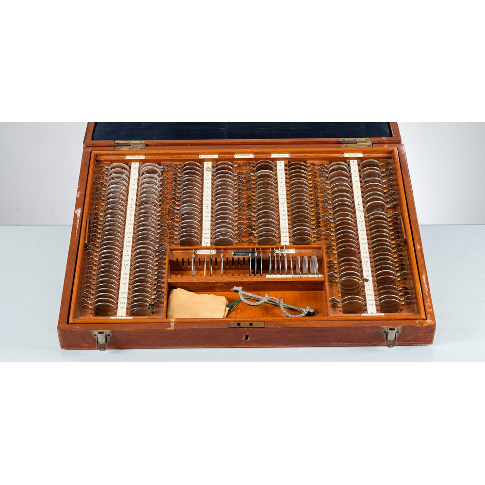 Cassetta "Keeler Optical product" in legno con set per optometristi vittoriani.