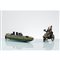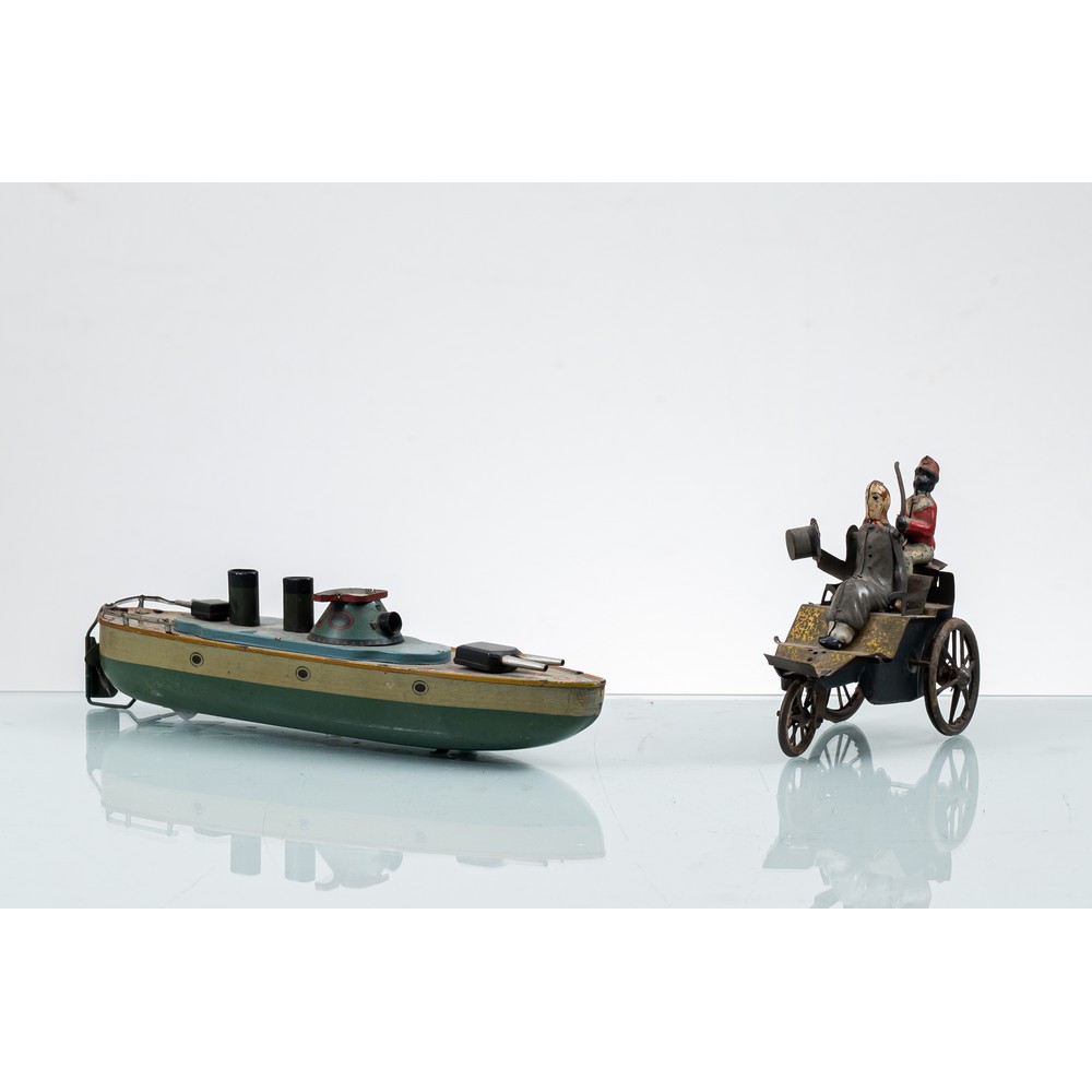 Due modellini giocattolo in latta raffiguranti "Nave da guerra" e "Risciò con figure" (usure e mancanze).