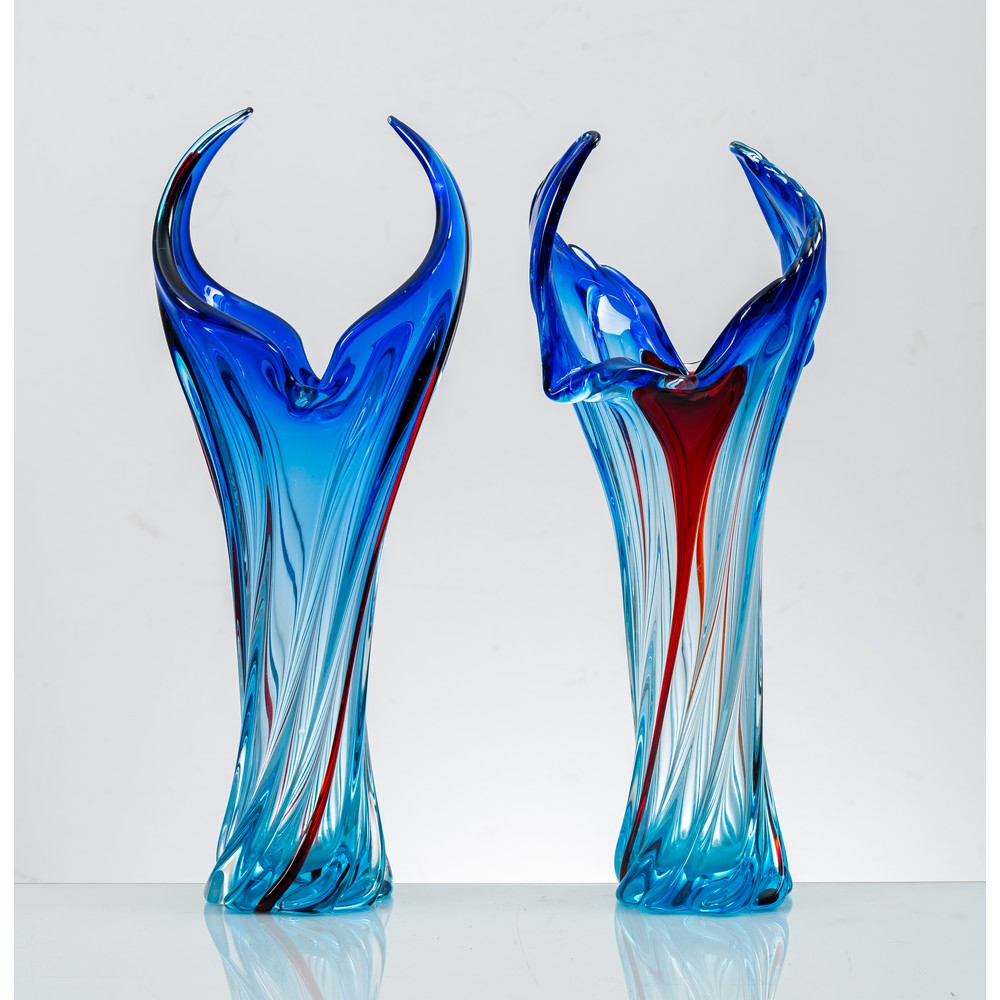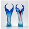 Due vasi in vetro colorato nei toni del blu e dell'azzurro.