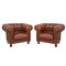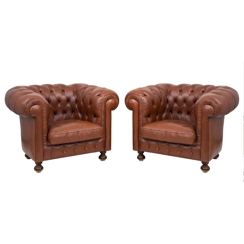 Coppia di poltrone a pozzetto tipologia Chesterfield in pelle marrone, spalliera e braccioli a capitonné.