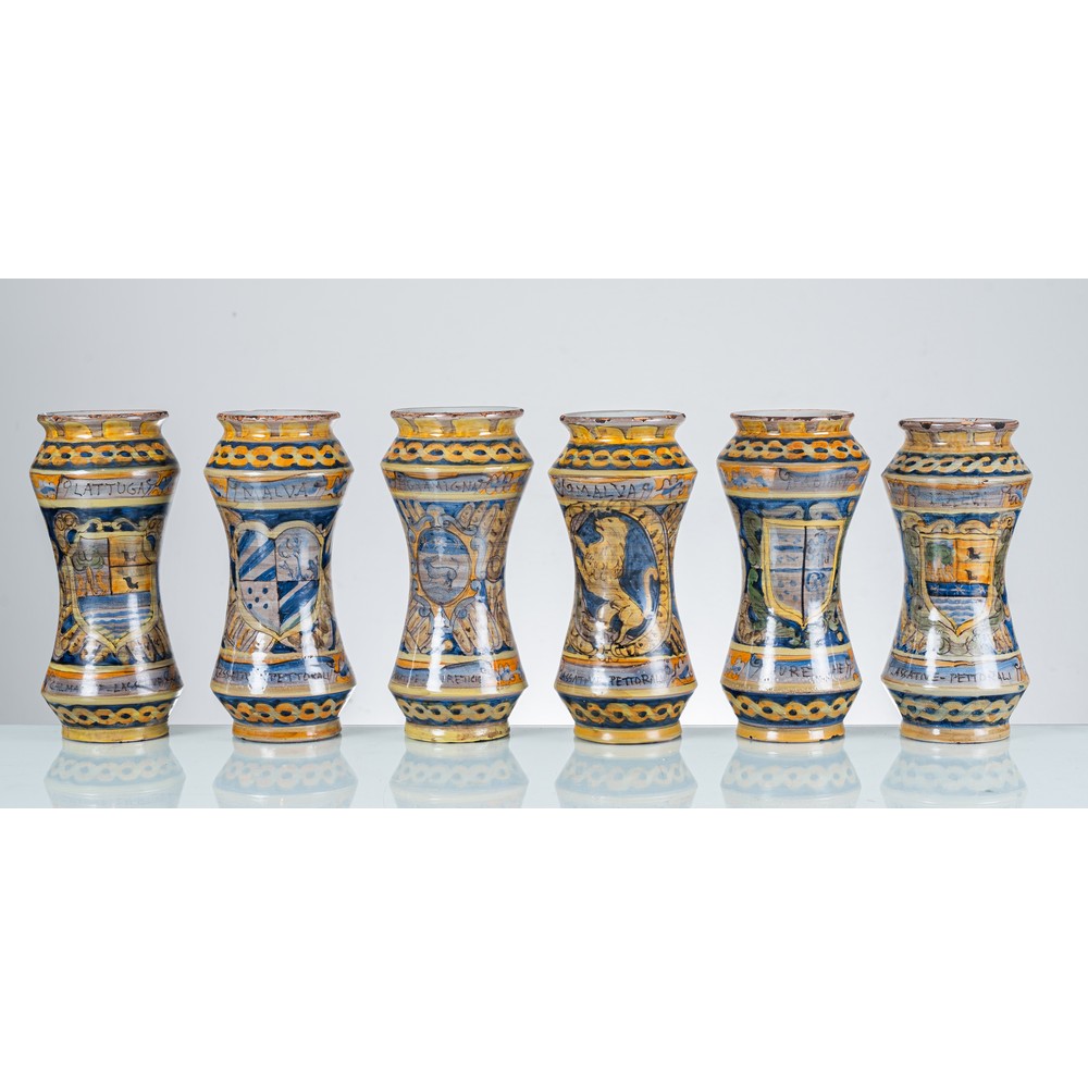 Sei albarelli stile settecentesco in ceramica smaltata e decorata, prodotti per il Casato della Famiglia Bordonaro.