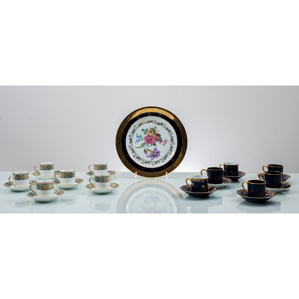Sei tazze con piattino nei toni del blu, sei tazzine con piattino nei toni del bianco e piatto da dessert in porcellana Limoges decorata e lumeggiata in oro.