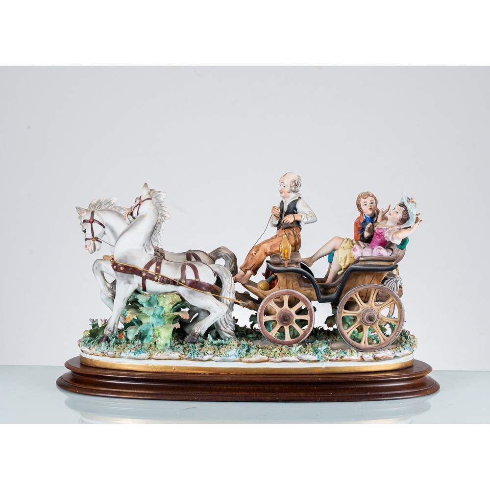 Gruppo in biscuit policromo raffigurante "Carrozza con figure" con base in legno (usure).