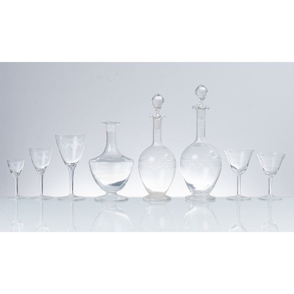 Servizio di bicchieri in cristallo inciso composto da 2 bottiglie vino, 11 bicchieri acqua, 12 bicchieri vino e 11 bicchieri liquore.