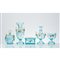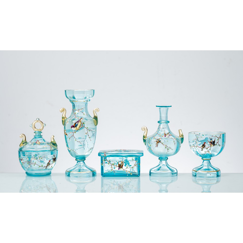Due vasi, potiche, ciotola e cofanetto in vetro nei toni del celeste dipinto a mano a motivo di volatili e floreale (rotture a due anse).