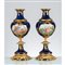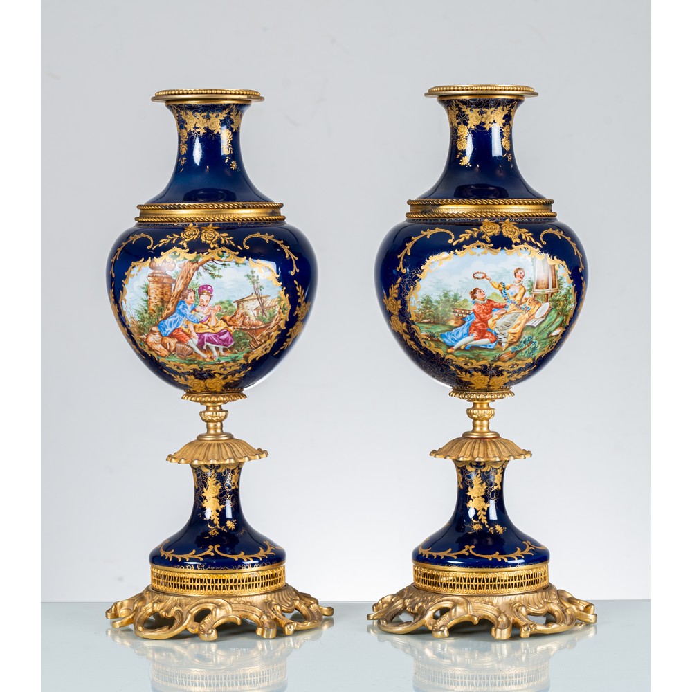 Coppia di vasi in porcellana di Sevres dipinta e lumeggiata in oro con medaglioni raffiguranti "Scene di corteggiamento", basi in bronzo dorato.