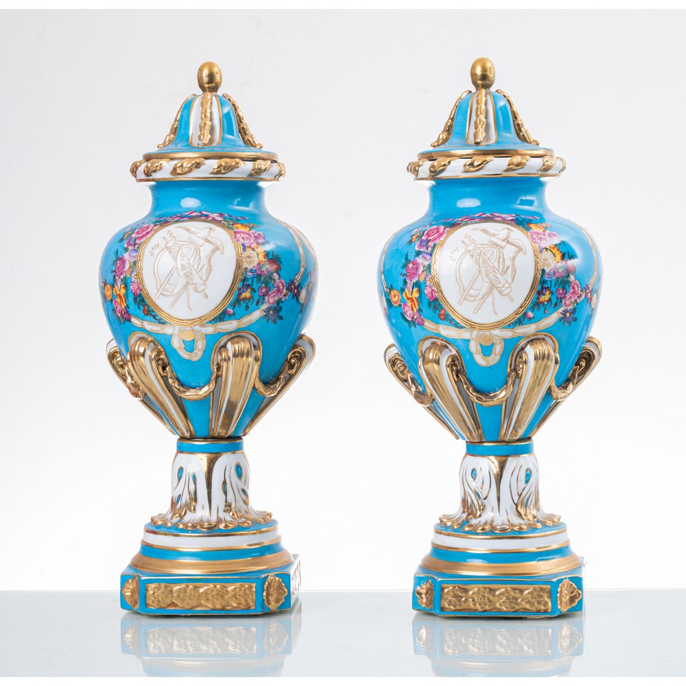 Coppia di potiche in porcellana Sevres decorata e dipinta con decori raffiguranti "Paesaggi con scene galanti".