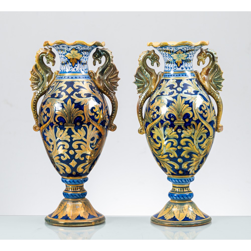 Coppia di vasi in ceramica smaltata e decorata con anse raffiguranti "Cavallucci marini".