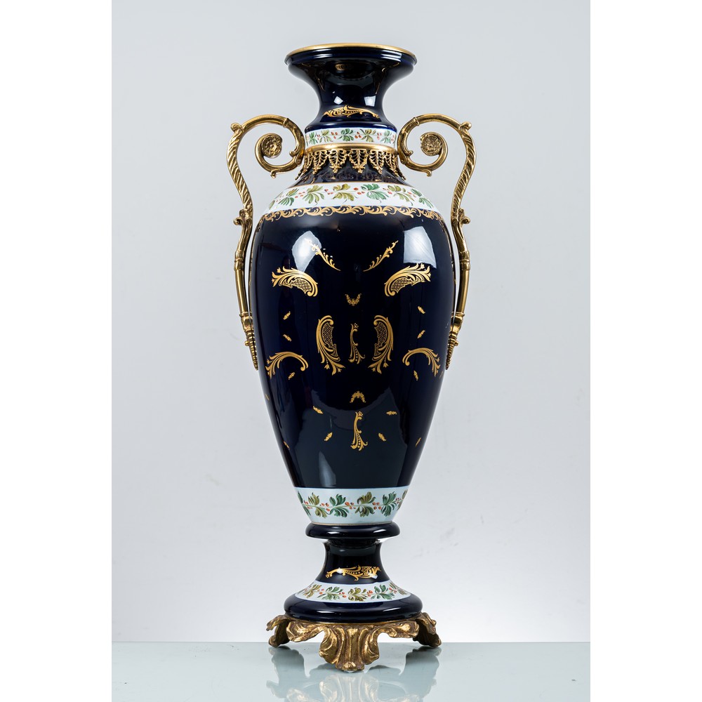 Grande vaso in porcellana nei toni del blu con lumeggiature in oro, anse e base in bronzo dorato.