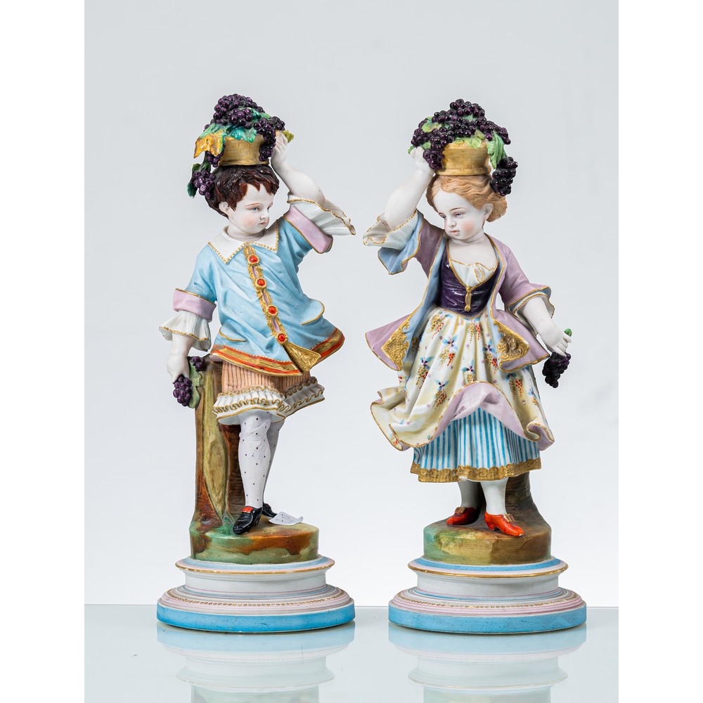 Coppia di sculture in biscuit policromo raffiguranti "Fanciulli con cesti di vite".