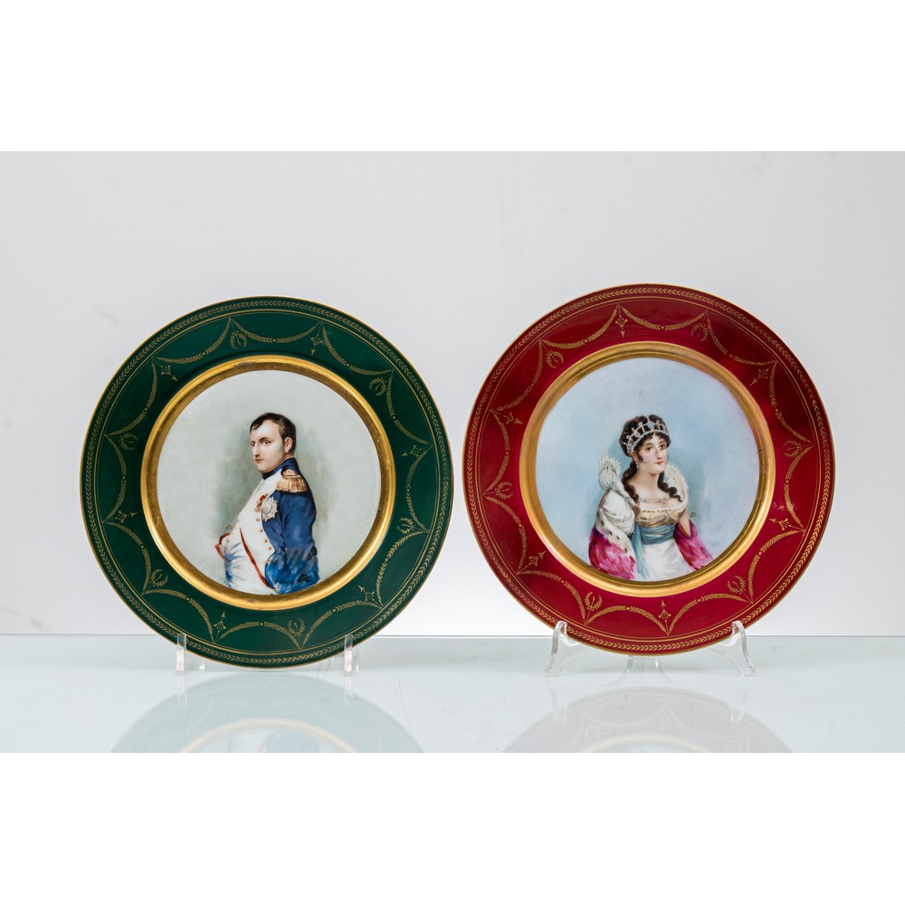 Coppia di piatti in porcellana decorata a decalcomania raffigurante "Napoleone Bonaparte" e "Maria Giuseppina" con lumeggiature in oro.
