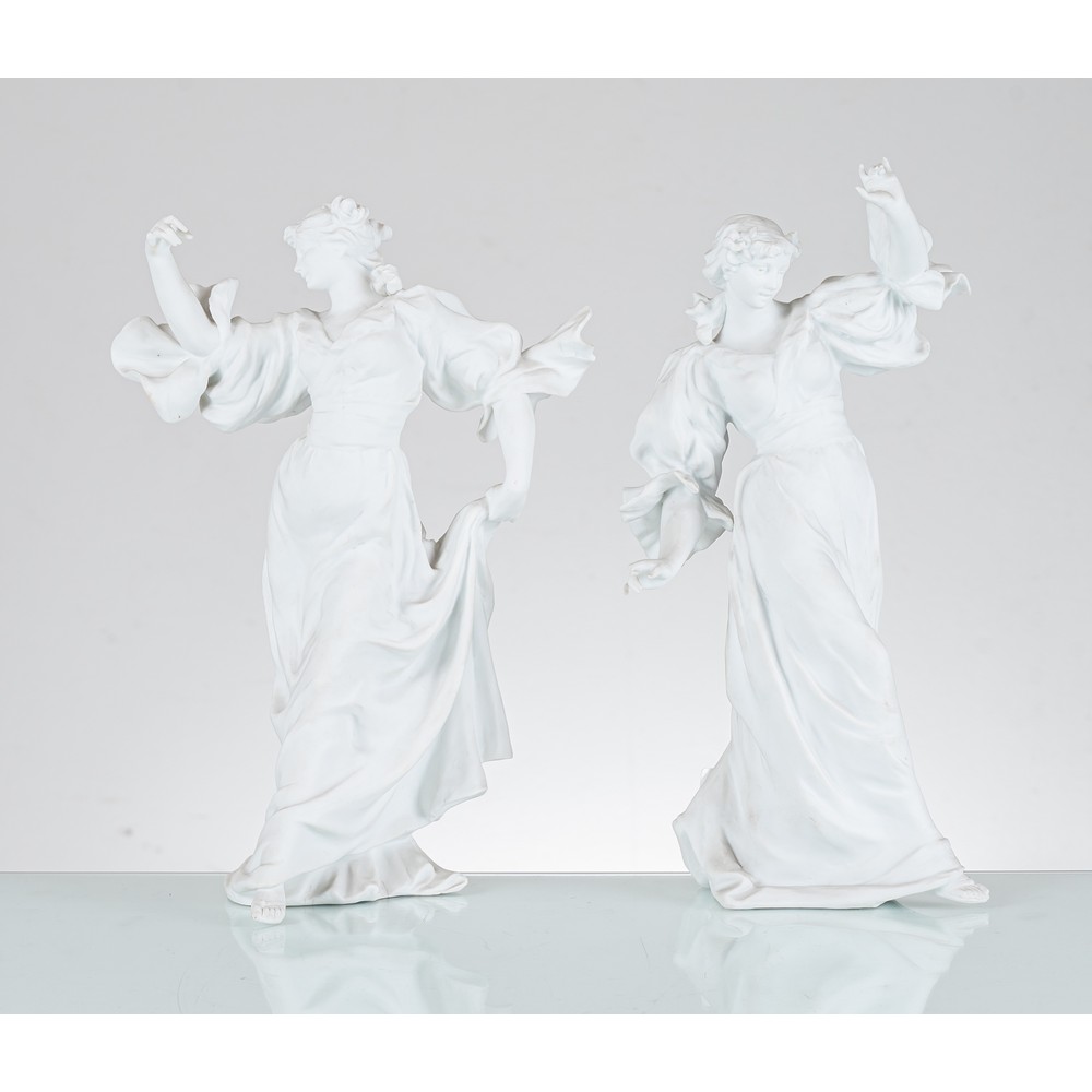 Coppia di sculture in biscuit raffiguranti "Figure femminili danzanti" (usure e restauro al braccio).