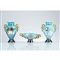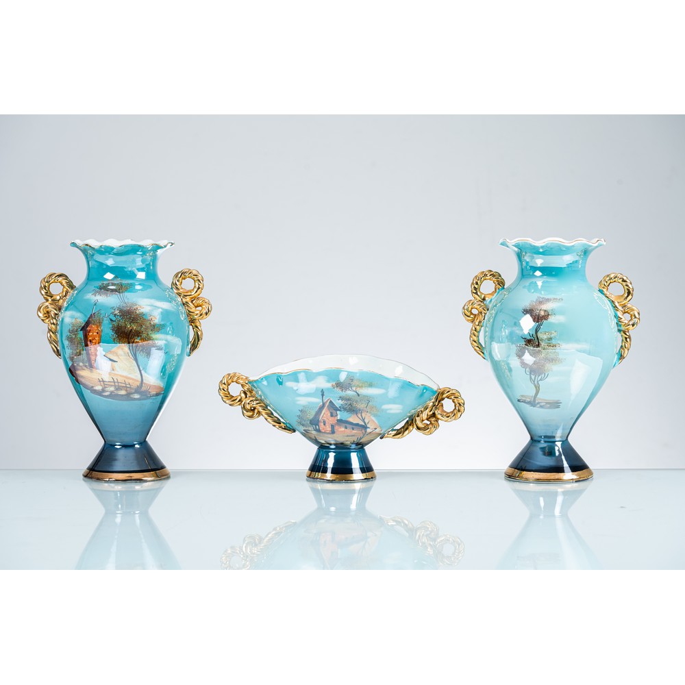 Trittico in ceramica decorata composto da due vasi e alzata.