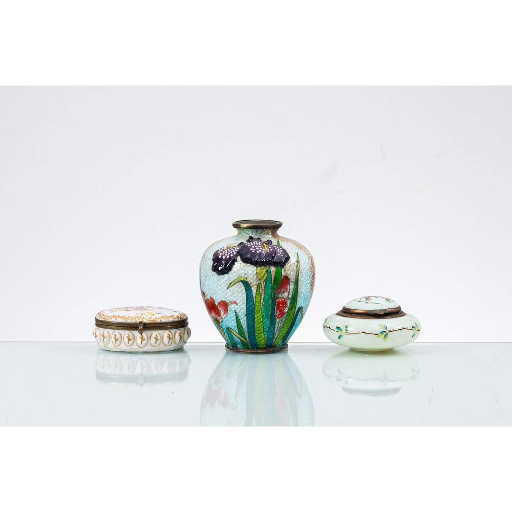 Piccolo vaso in metallo invetriato e due piccole scatole in opaline e porcellana.