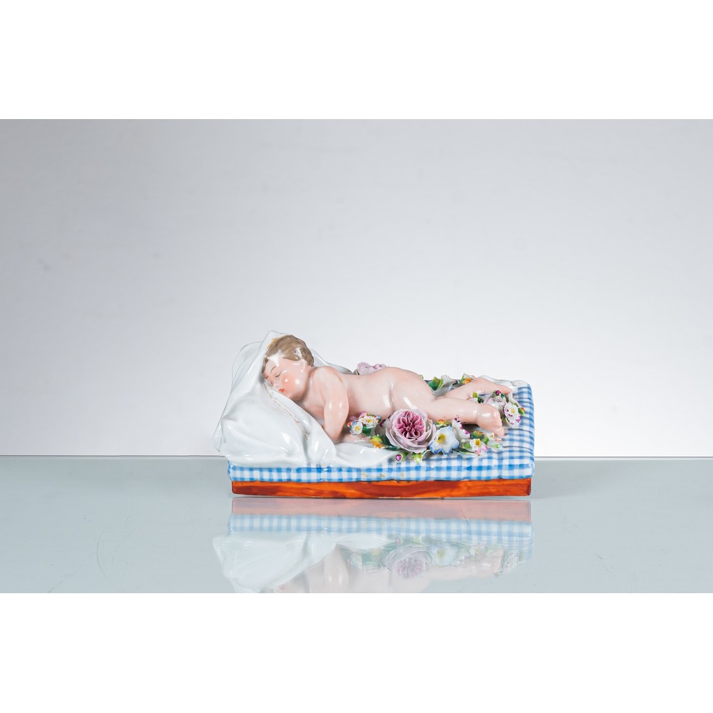 Scultura in porcellana Jacob Petit raffigurante "Bambino che dorme con fiori".