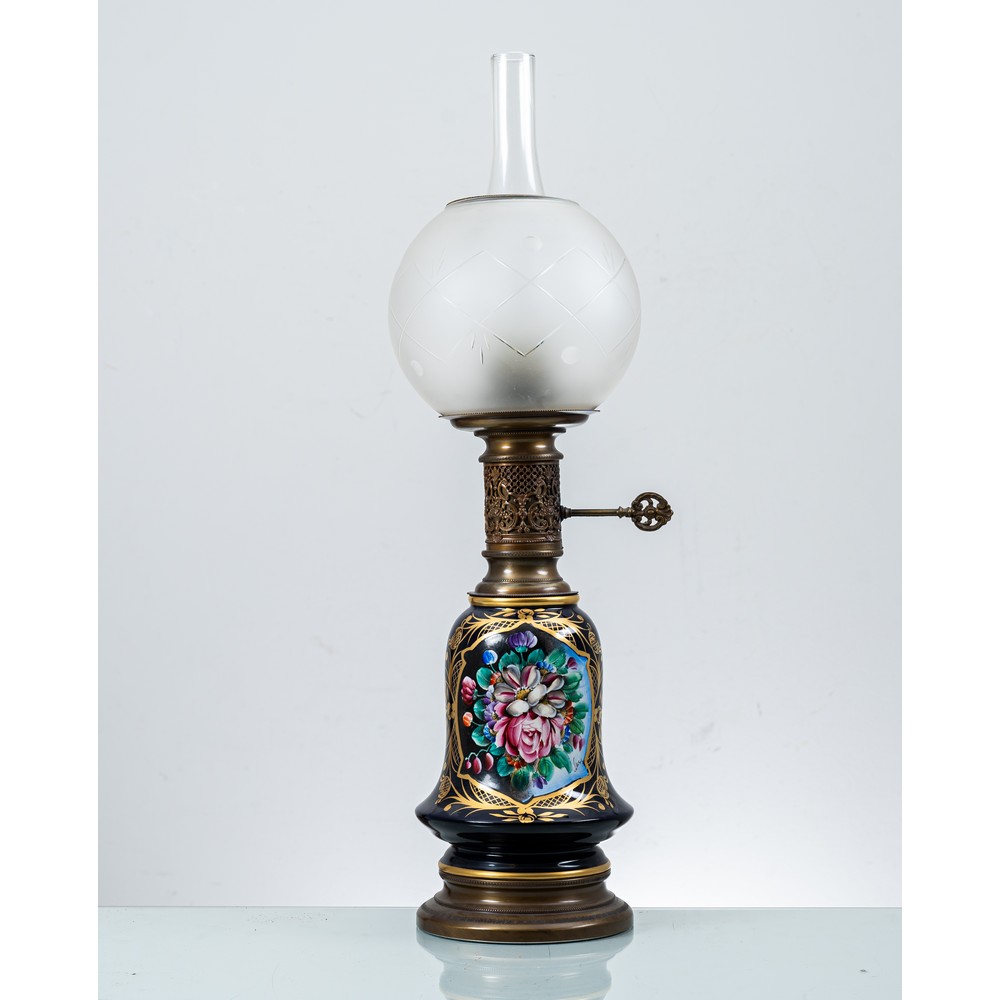 Lume in porcellana decorata nei toni del blu cobalto, base e struttura in ottone, boccia e tubo in vetro.