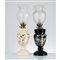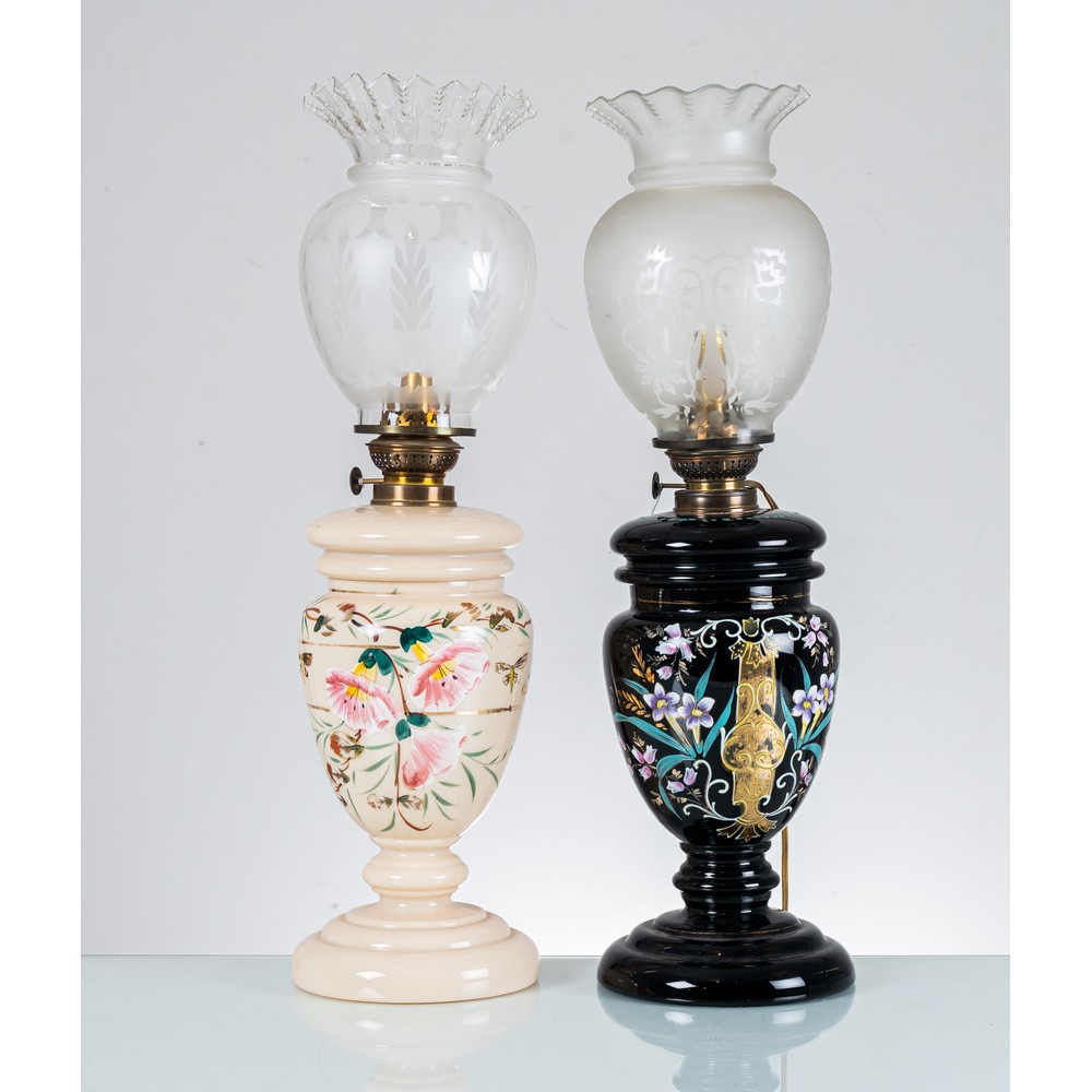 Lume in vetro opaline decorato a motivo floreale con lumeggiature in oro nei toni del nero, boccia in vetro inciso e lume in vetro opaline nei toni del beige a motivo floreale e fogliaceo, boccia in vetro inciso.