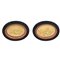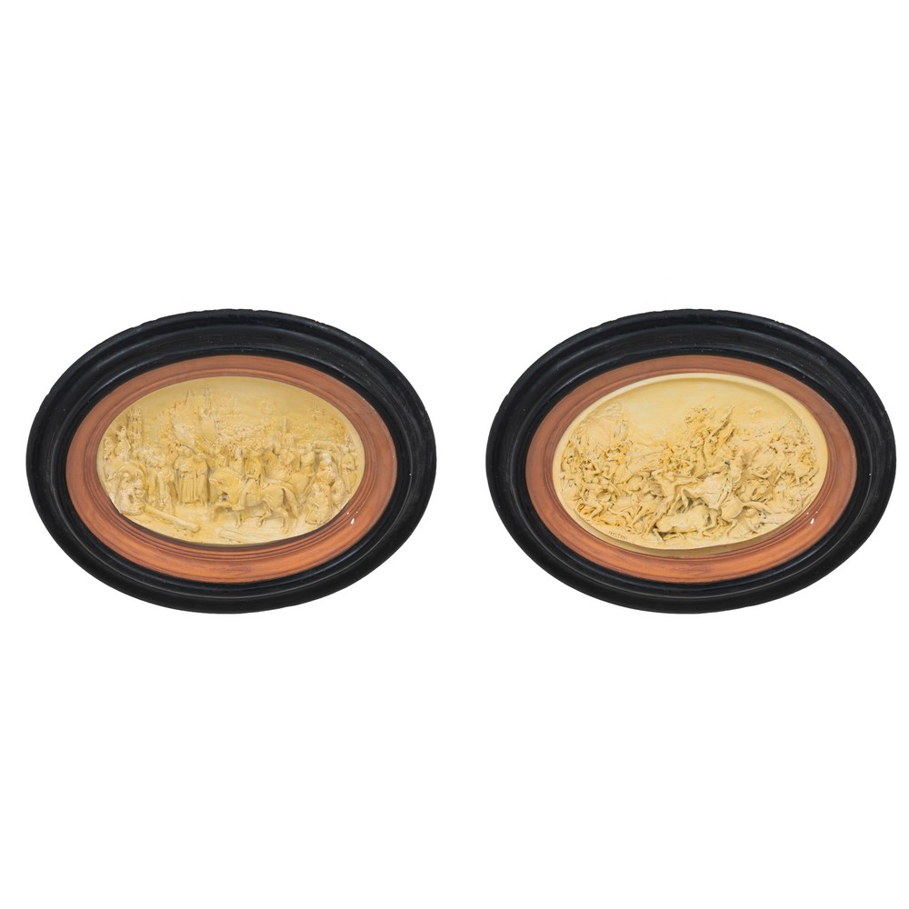 Coppia di gruppi in schiuma di gesso raffiguranti "Battaglie" entro cornici in legno ebanizzato di forma ovale.