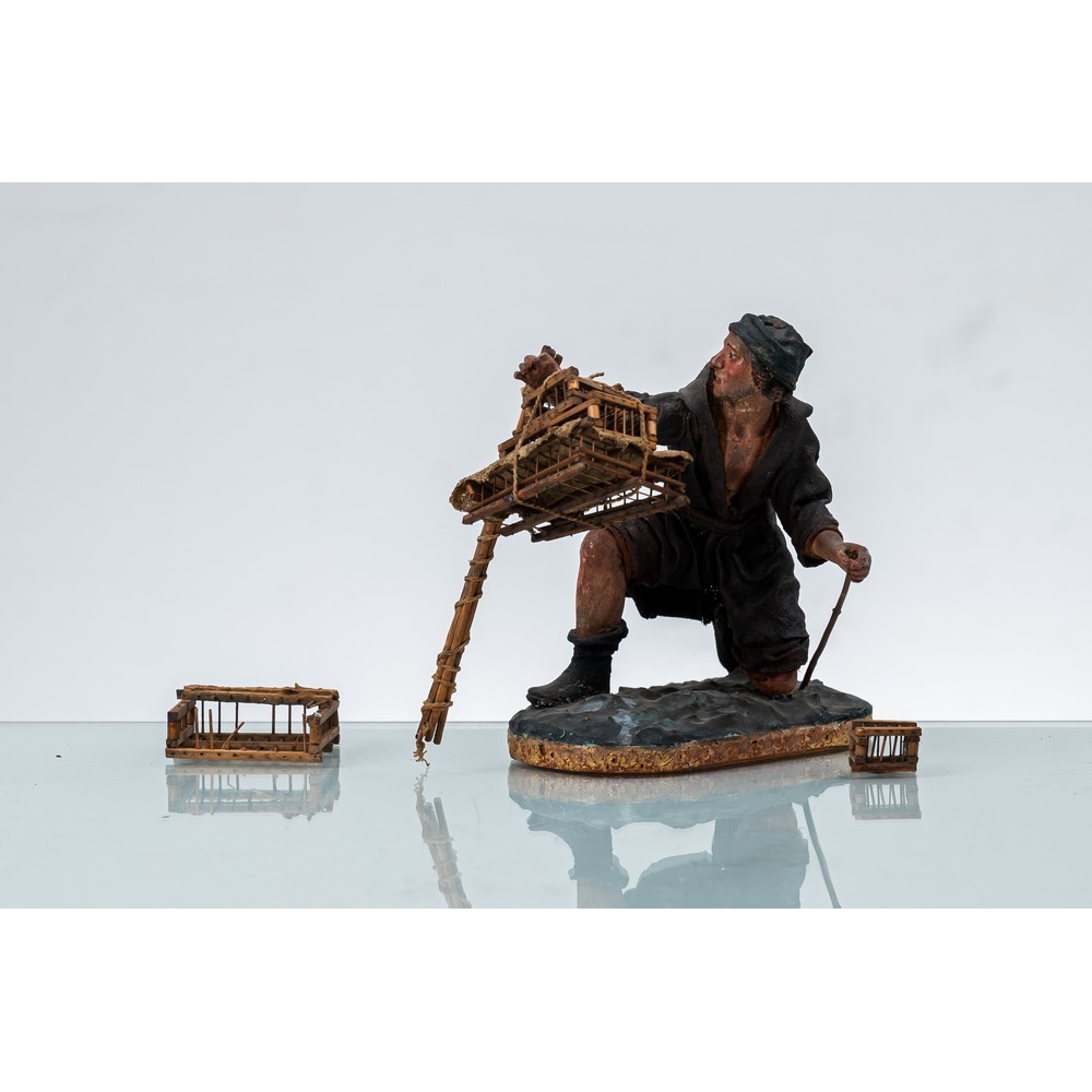 Scultura da presepe in legno e cartapesta raffigurante "Venditore di gabbiette".