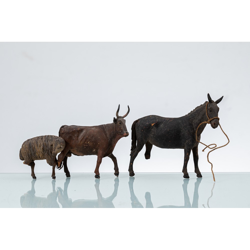 Tre sculture da presepe raffiguranti "Cavallo", "Bue" e "Pecora" (rotture).
