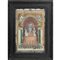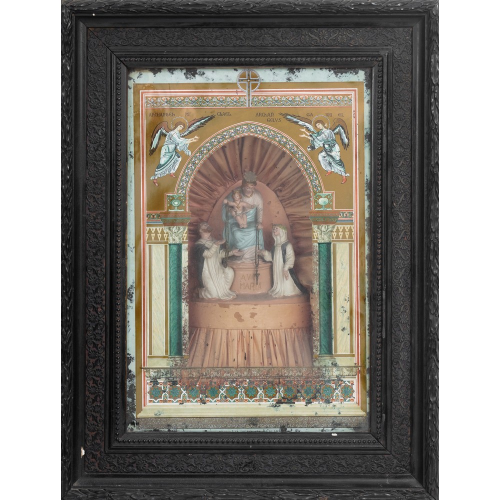 Capezzale realizzato da un gruppo in terracotta policroma raffigurante "La Madonna del Rosario con San Domenico e Santa Caterina" entro cornice in legno ebanizzato.