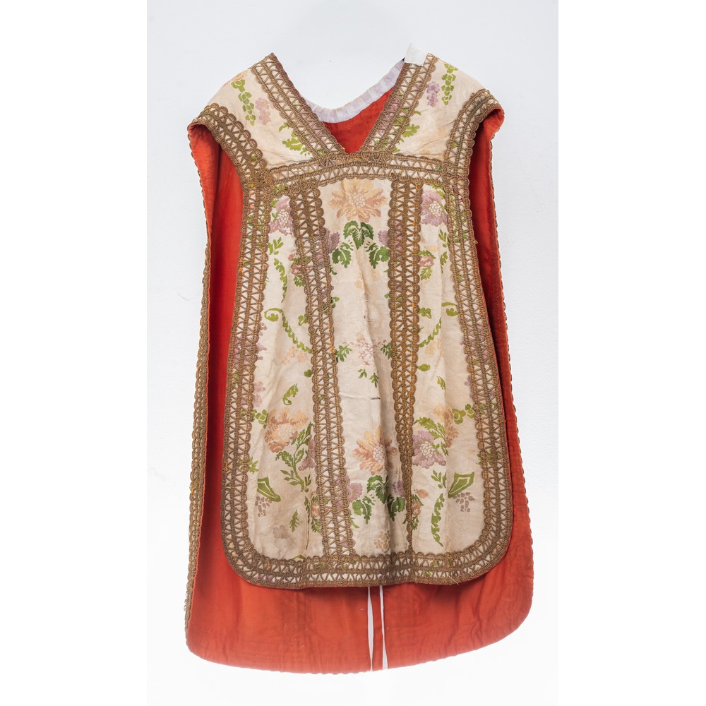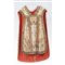 Pianeta in stoffa riccamente lavorata a mano con riquadrature a fili dorati.