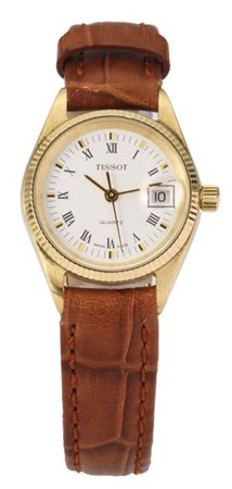 TISSOT Solo tempo oro giallo anni '80 donna Diametro 26 mm Cassa in tre parti con lunetta godromata, quadrante con indici applicati e numeri romani serigrafati. Movimento al quarzo. A woman gold only time 80's wristwatch