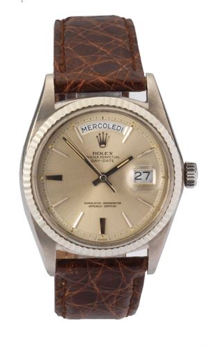 ROLEX Oyster Perpetual Day Date in oro bianco. Ref. 1803 del 1977 Diametro 36 mm Cassa in tre corpi con fondello e corona a vite, lunetta godronata. Quadrante con indici applicati, finestrella per giorno ad ore 12 e data ad ore 3. Movimento automatico An white gold Oyster Perpetual Day Date. Ref. 1803 1977