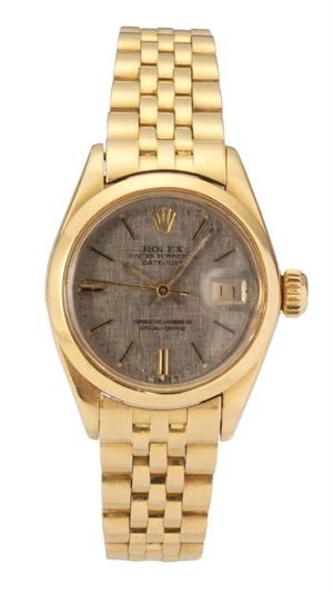 ROLEX Oyster perpetual datejust misura lady in oro giallo. Referenza 6917 del 1973 Diametro 26 mm Cassa oyster in tre parti con fondo e corona a vite, bracciale jubilé, quadrante tapisserie con indici applicati. Movimento automatico. An yellow gold oyster perpetual datejust lady size. Reference 6917 1973