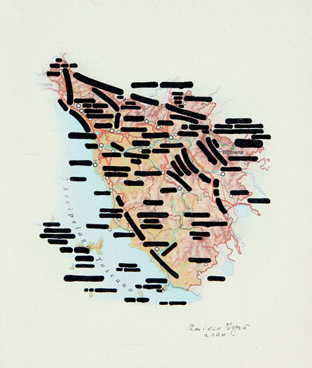 ISGRO' EMILIO Arcipelago toscano 2000 tecnica mista su cartoncino cm. 27 X 22 Firma, data 'Emilio Isgrò, 2000' (in basso a destra) Titolo, tecnica, misure, numerazione 'Arcipelago toscano, tecnica mista su carta, cm 27x22, CL20' (al retro) Autentica dell'artista su fotografia