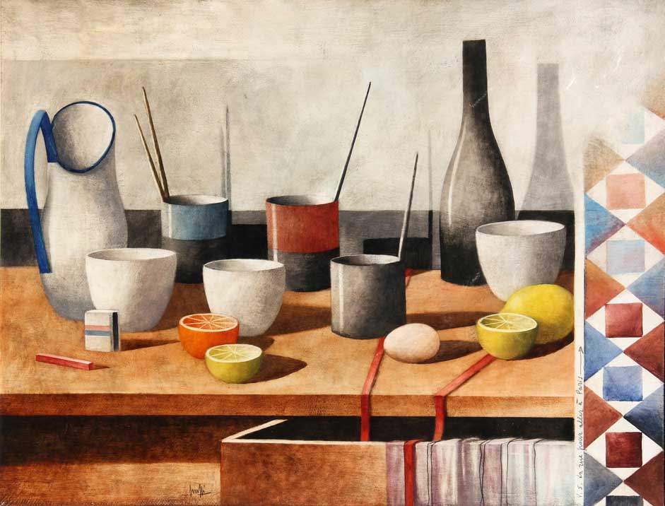 SCUFFI MARCELLO Natura morta con la greca 2001 olio su tela cm. 60 X 80 Firma 'Scuffi' (in basso a sinistra); scritta 'V.S. la rue pour aller a Paris' (in basso a destra) Titolo, firma, data 'N.M. con la greca, V.S. la rue pour aller a Paris, Scuffi, 2001' (al retro) Autentica dell'artista su fotografia, con n° di archiviazione 881 Certificato di provenienza della galleria Orler