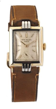 PATEK PHILIPPE Esemplare unico su commissione in oro giallo e bianco. ref 1930 Esemplare speciale in stile decò realizzato su commissione nel 1929. Cassa bicolore in due ori, corpo centrale, carrure in oro giallo, parte superiore lunetta e anse tipo vendome in oro bianco. Quadrante argentato con inditi in oro applicati, indicazione ore e minuti e piccoli secondi ad ore 6. Movimento meccanico a carica manuale da 9 limee n 822470. Corredato di astuccio, estratto di registro della Maison e documentazione biografica. An yellow and white gold one-off made on commission. ref 1930