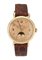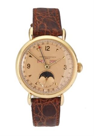 VACHERON & CONSTANTIN Calendario completo fasi luna referenza 4241 anni '40 in oro giallo Diam 36 mm Cassa sagomata in oro giallo in 2 corpi con anse a goccia, quadrante salmone con indici e numeri applicati, finestrella per giorno e mese a ore 12, secondi continui e fasi luna a ore 6, datario periferico, movimento a carica manuale calibro 495/1. Corredato di estratto di registro della Maison. An yellow gold full moon phases calendar reference 4241 years 40's