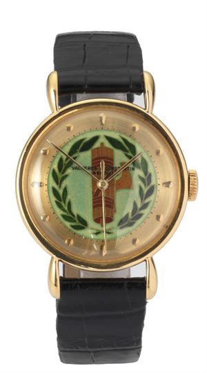 VACHERON & CONSTANTIN Particolare e raro orologio in oro giallo anni '40 Diam 34 mm Cassa scanalata a 3 gradini e anse a goccia, quadrante in smalto cloisonnè raffigurante il Fascio Littorio. Movimento a carica manuale calibro P454/5. Special and rare yellow gold watch 40s