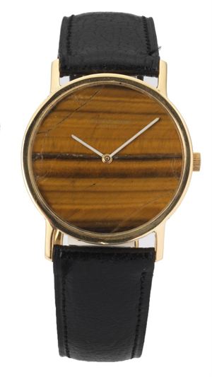 VACHERON & CONSTANTIN Solo tempo in oro giallo "Demi plat" anni '80 Diametro 33 mm Cassa in due corpi, quadrante in pietra dura occhio di tigre (con difetti, filato). Movimento a carica manuale. An yellow gold only time "Demi plat" 80's