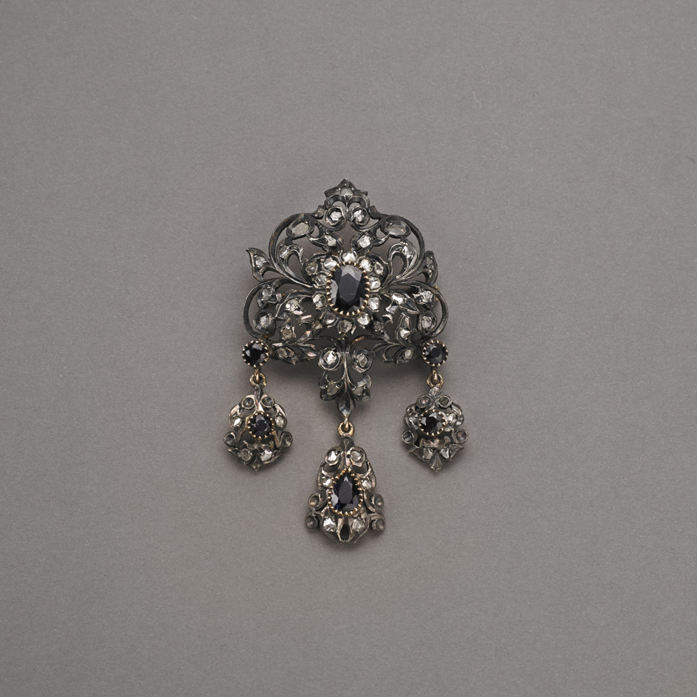 Lot 16 | Spilla in oro giallo e argento a tre pendenti, con al centro zaffiri ovali,...